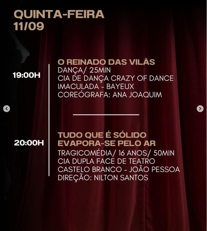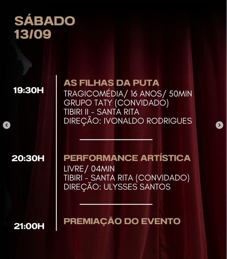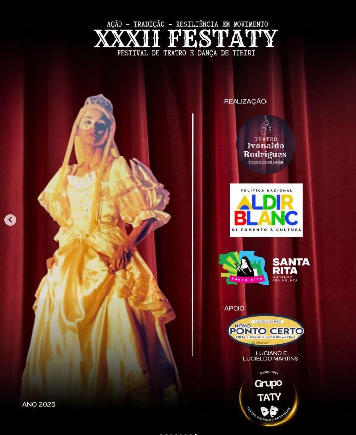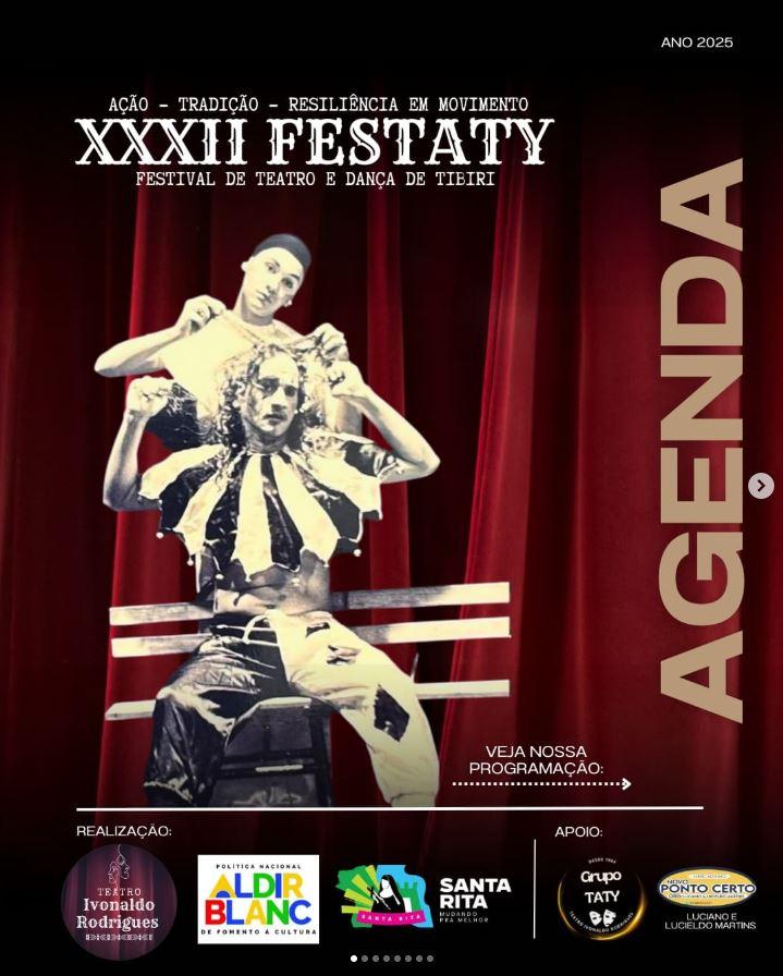 Começa nesta segunda-feira, 08, e segue até o próximo sábado, 13, o XXXII Festaty - Festival de Teatro e Dança de Tibiri. O Festival acontece no Teatro Ivonaldo Rodrigues, em Tibiri, e tem espetáculos diariamente a partir das 19h00. A entrada é de graça!