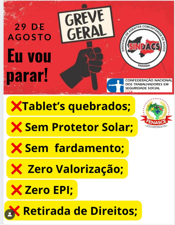 Os Agentes Comunitários de Saúde (ACS) de João Pessoa deverão paralisar suas atividades no próximo dia 29 e poderão deflagar greve geral por tempo indeterminado a partir dessa data. É o que informa a nota publicada pelo Sindicato da categoria no instagram @sindacspb.