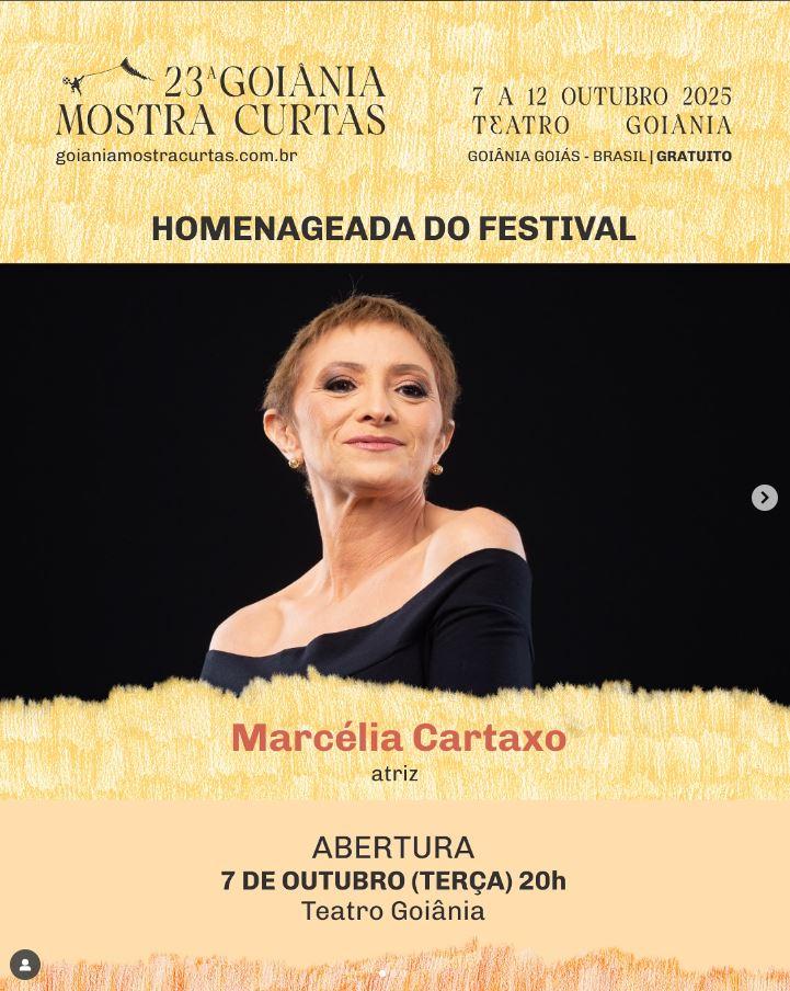 O ano de 2025 está sendo de homenagens à atriz paraibana Marcélia Cartaxo. Depois de receber o Troféu Oscarito e ser a homenageada do Festival de Gramado, agora é a vez da 23ª edição do Goiânia Mostra Curtas, que acontecerá entre os dias 7 e 12 de outubro de 2025.