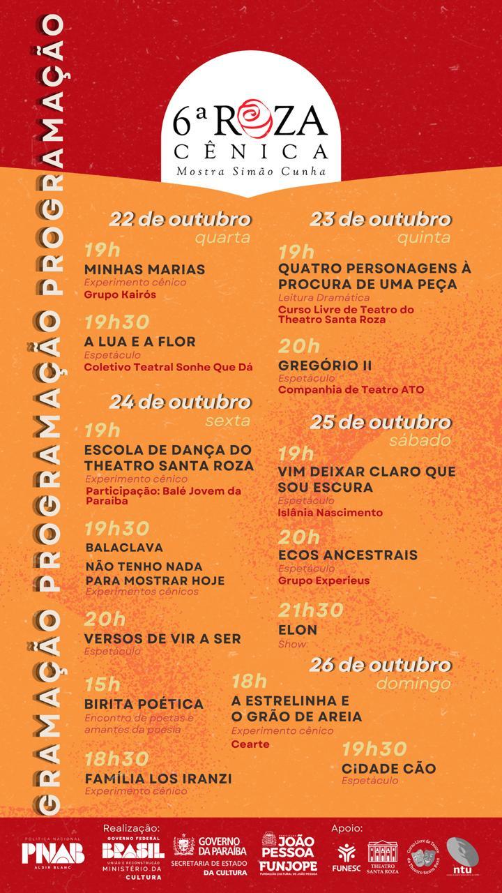 Estas ações integram os projetos VI Roza Cênica – Mostra Simão Cunha e Caminhos da Cena: Ocupa Santa Roza, contemplados, respectivamente, pelo edital nº 60.010/2024 da Prefeitura Municipal de João Pessoa, por meio da FUNJOPE, e edital nº 0013/2025 da Secretaria de Cultura do Estado da Paraíba, ambos realizados com recursos da Política Nacional Aldir Blanc de Fomento à Cultura – PNAB (Lei nº 14.399/2022).