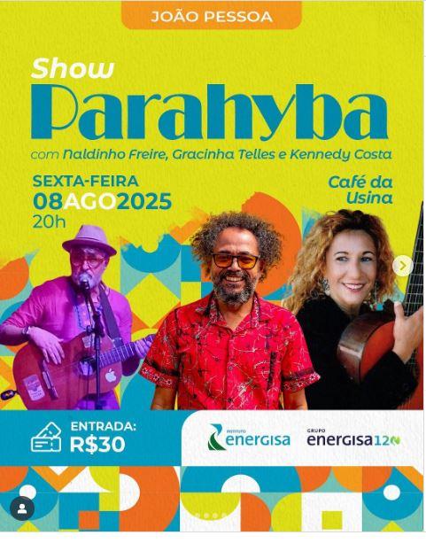 O Café da Usina, localizado na Usina Cultural Energisa (Rua João Bernardo de Albuquerque, 243 - Tambiá), em João Pessoa, apresenta nesta sexta-feira, 08, a partir das 20h00, o show "Parahyba", que vai colocar no mesmo palco os talentos de Naldinho Freire, Gracinha Telles e Kennedy Costa. "Uma celebração da autoria e da genialidade de três ases contemporâneos da música parahybana", destaca o material de divulgação do show nas redes sociais.
