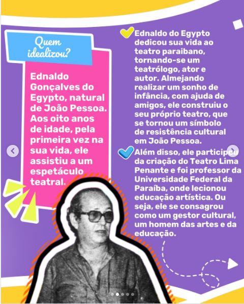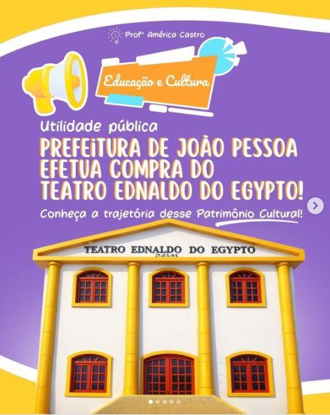 Uma excelente notícia para o meio cultural da Paraíba acabou de ser anunciada: a efetivação da compra do Teatro Ednaldo do Egypto pela Prefeitura Municipal de João Pessoa, através da Secretaria Municipal de Educação e Cultura. A novidade foi publicada no instagram da Secretária de Educação e Cultural da Capital, professora América de Castro, na manhã desta terça-feira, 07 de janeiro.